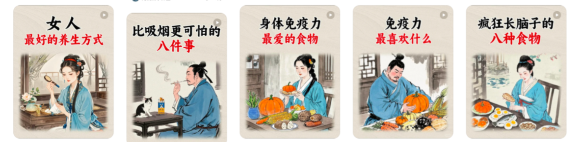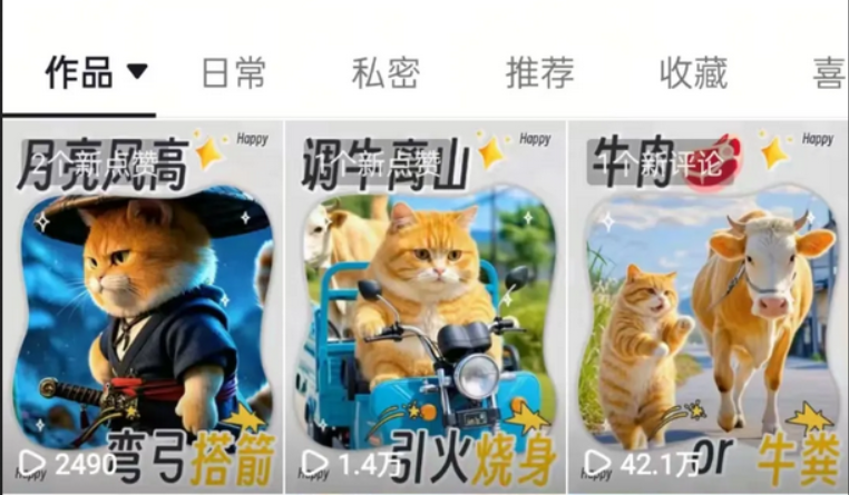 不敢拍不想拍的也可以用AI制作视频,用AI做出来的视频种类层出不穷,有诗词、养生、美女、搞笑、治愈、猫咪、玩梗、等等各种赛道。